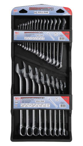 - 25 részes csillag-villáskulcs készlet, műanyag hordozható vagy felakasztható tartóban.