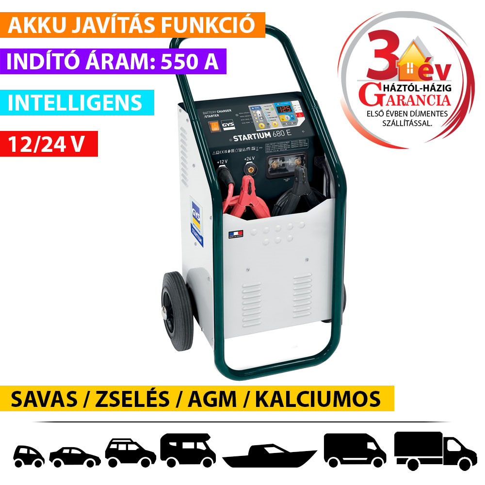 A STARTIUM 680E egy automata, 12 - 24 V-os akkumulátortöltő-indító kerekekkel ellátva. Mikroprocesszoros vezérlése maximális hatékonyságot és biztonságot garantál Önnek.